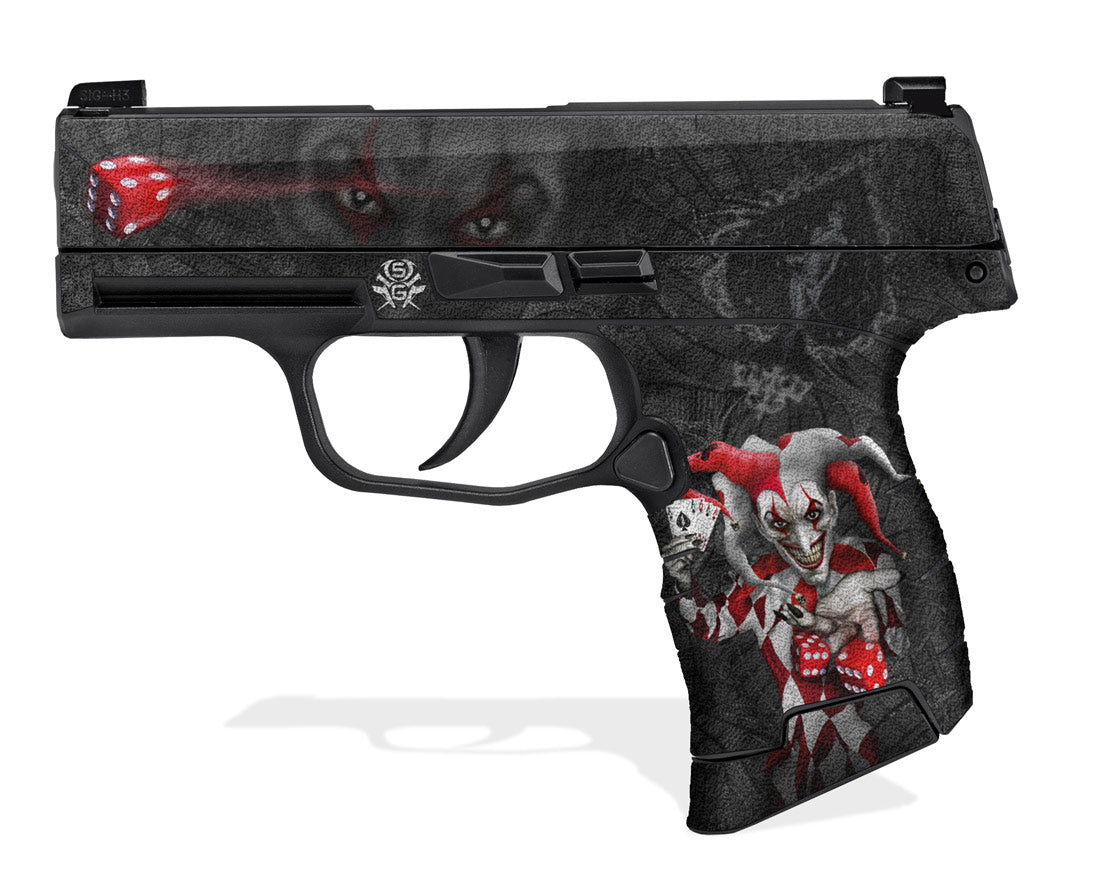 Decal Grip for Sig Sauer P365 Micro-Compact. Features a tactical, rubberized, textured grip surface that gives you a better, more comfortable hold of the Sig P365. The Joker design by Invision Artworks.