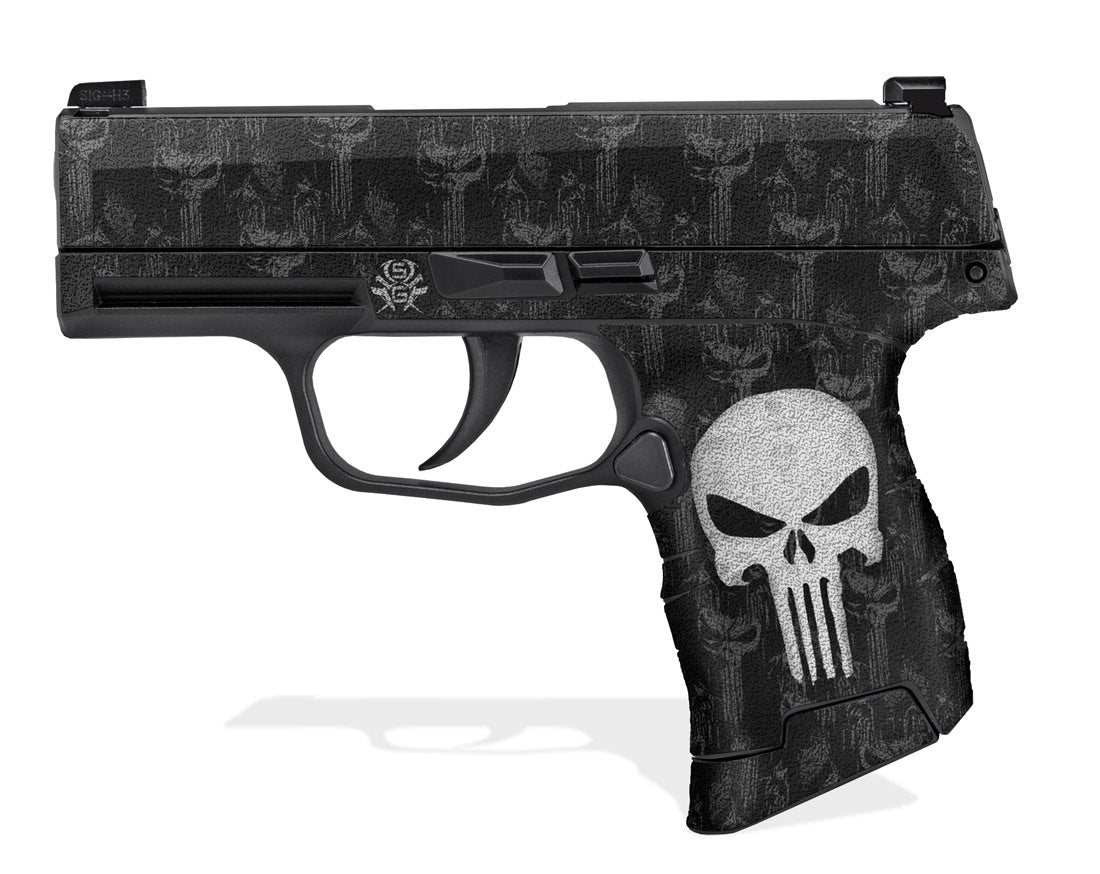 Decal Grip for Sig Sauer P365 Micro-Compact. Features a tactical, rubber-like, textured grip surface that gives you a better, more comfortable hold of the P365. The Punisher design.