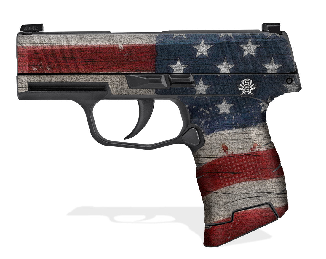 Decal Grip for Sig Sauer P365 SAS. Features a tactical, rubber-like, textured grip surface that gives you a better, more comfortable hold of the P365. Old Glory design.