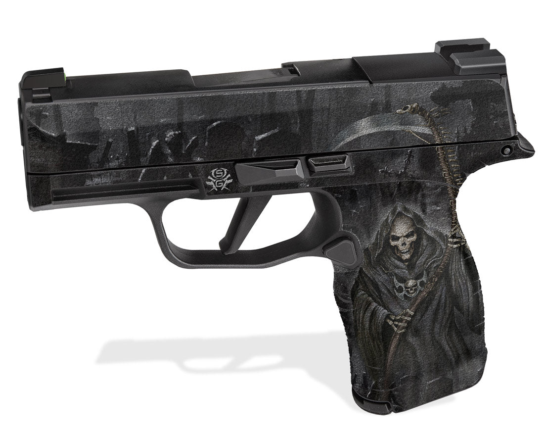 Decal Grip for Sig P365-X & P365X ROMEO Zero. Features an amazing rubber-like, textured grip surface for better grip and more control. Cover just the frame or apply it to the slide as well. Grim Reaper design. Note: Slight trimming is required for ROMEO sight.