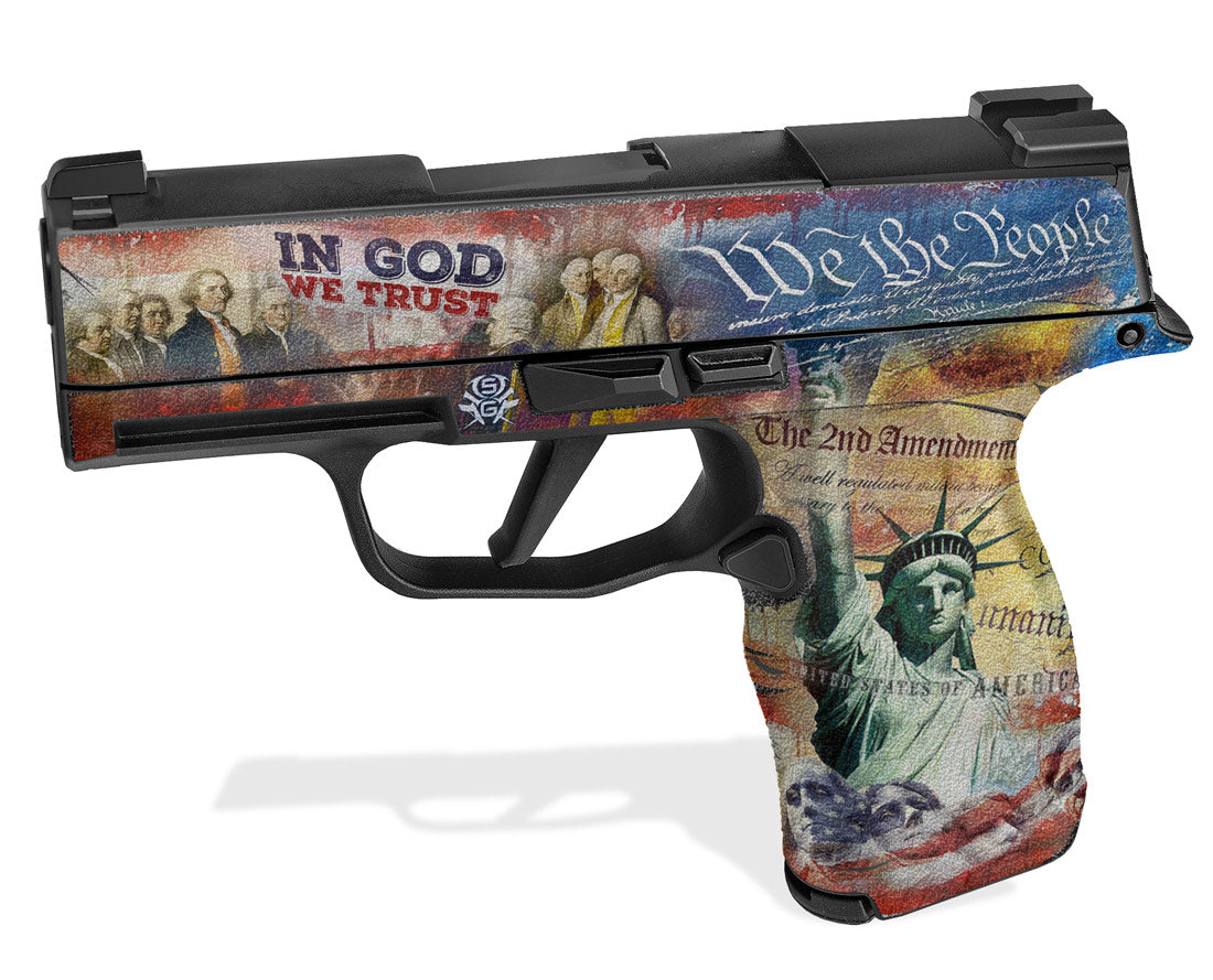 Sig P365-X & P365X ROMEO Zero Decal Grip. Features an amazing rubberized, textured grip surface for better grip and more control. Cover just the frame or apply it to the slide as well. We The People design. Note: Slight trimming is required for ROMEO sight.