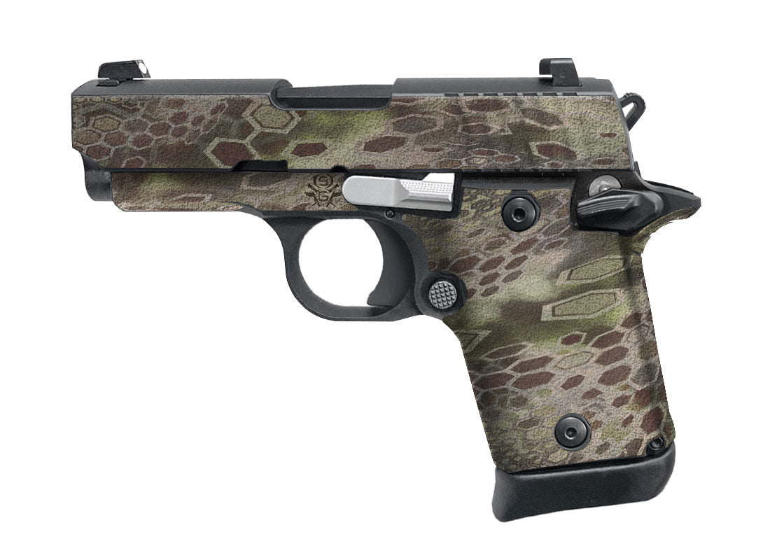 Decal Grip for Sig P938 – Showgun decal grips are manufactured with a rubberized, textured vinyl, and 3M adhesive specially formulated to mold into textured surfaces and stays on through harsh environments and conditions. Cover just the frame of your P938 or apply it to the slide as well. The rubberized feel is not only non-slip, but it won’t chaff or irritate your skin. Cryptic Camo design.