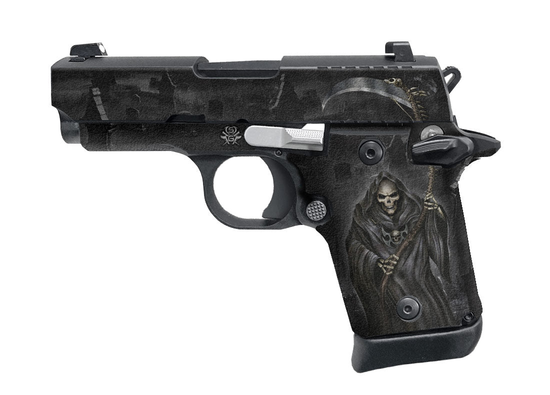 Decal Grip for Sig P938 – Showgun decal grips are manufactured with a rubberized, textured vinyl, and 3M adhesive specially formulated to mold into textured surfaces and stays on through harsh environments and conditions. Cover just the frame of your P938 or apply it to the slide as well. The rubberized feel is not only non-slip, but it won’t chaff or irritate your skin. Grim Reaper design.
