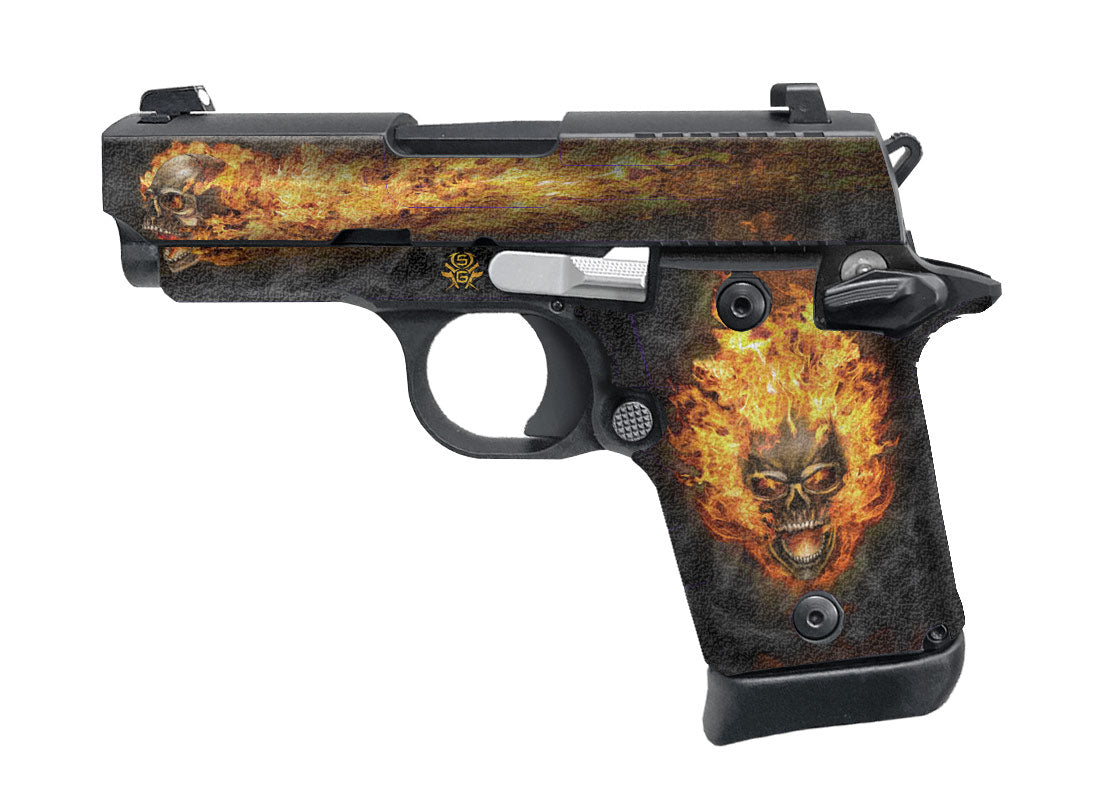 Decal Grip for Sig P938 – Showgun decal grips are manufactured with a rubberized, textured vinyl, and 3M adhesive specially formulated to mold into textured surfaces and stays on through harsh environments and conditions. Cover just the frame of your P938 or apply it to the slide as well. The rubberized feel is not only non-slip, but it won’t chaff or irritate your skin. Nitro design.