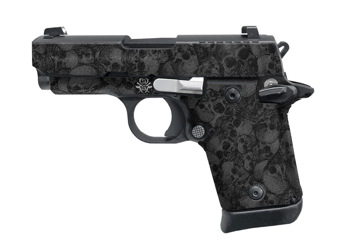 Decal Grip for Sig P938 – Showgun decal grips are manufactured with a rubberized, textured vinyl, and 3M adhesive specially formulated to mold into textured surfaces and stays on through harsh environments and conditions. Cover just the frame of your P938 or apply it to the slide as well. The rubberized feel is not only non-slip, but it won’t chaff or irritate your skin. Skull Collector design.