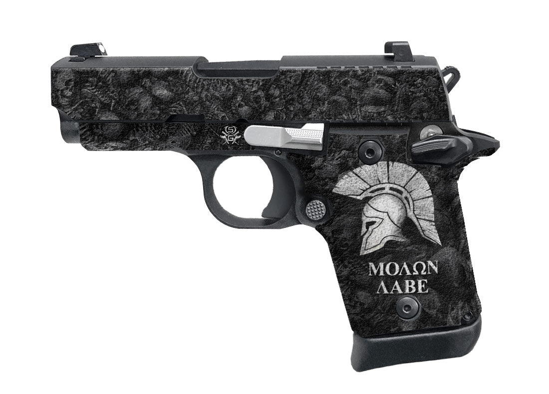 Decal Grip for Sig P938 – Showgun decal grips are manufactured with a rubberized, textured vinyl, and 3M adhesive specially formulated to mold into textured surfaces and stays on through harsh environments and conditions. Cover just the frame of your P938 or apply it to the slide as well. The rubberized feel is not only non-slip, but it won’t chaff or irritate your skin. Sparta / Molon Labe design.