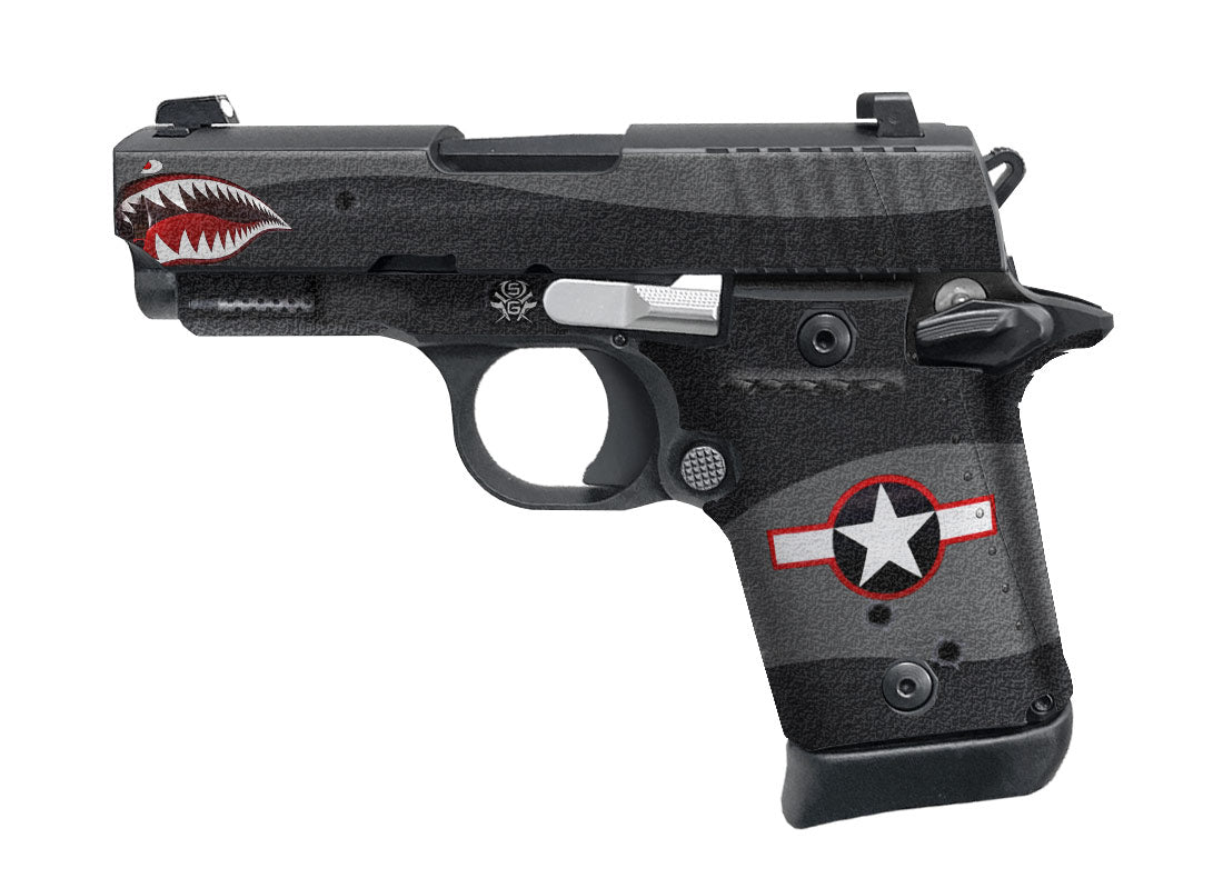 Decal Grip for Sig P938 – Showgun decal grips are manufactured with a rubberized, textured vinyl, and 3M adhesive specially formulated to mold into textured surfaces and stays on through harsh environments and conditions. Cover just the frame of your P938 or apply it to the slide as well. The rubberized feel is not only non-slip, but it won’t chaff or irritate your skin. War Machine design.