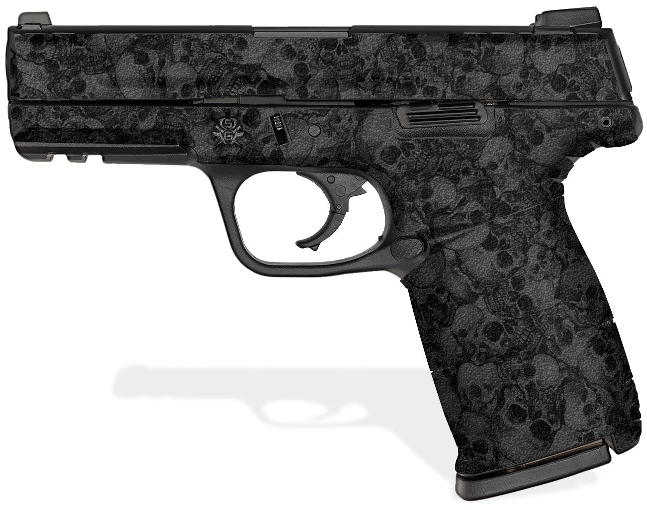 Showgun decal grips are manufactured with a rubberized, textured vinyl, and 3M adhesive specifically formulated to mold into textured surfaces and stay on through harsh environments and conditions. Cover just the frame or apply it to the slide as well. The rubberized feel is not only non-slip, but it won’t chaff or irritate your skin. Skull Collector design available here, templated to fit over 40 gun models (see below).