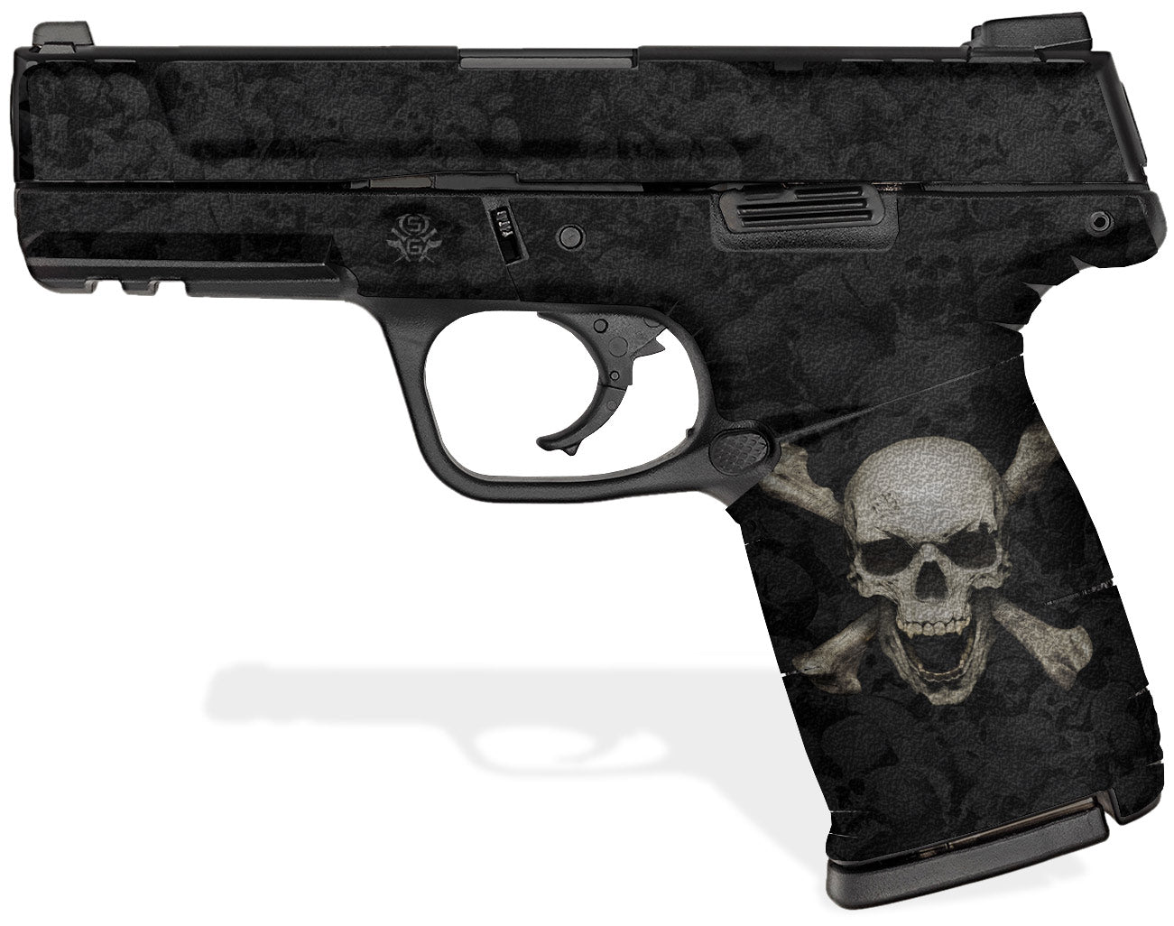 Showgun decal grips are manufactured with a rubberized, textured vinyl, and 3M adhesive specifically formulated to mold into textured surfaces and stay on through harsh environments and conditions. Cover just the frame or apply it to the slide as well. The rubberized feel is not only non-slip, but it won’t chaff or irritate your skin. Skull & Crossbones design available here, templated to fit over 40 gun models (see below).
