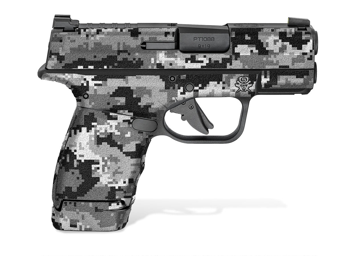 Springfield Hellcat Micro-Compact Decal Grip. Features an amazing rubberized, textured grip surface for a better, and more comfortable hold. Decal grip is precision cut to fit the Hellcat Micro-Compact. Cover just the frame or entire gun. Digital Camo design.