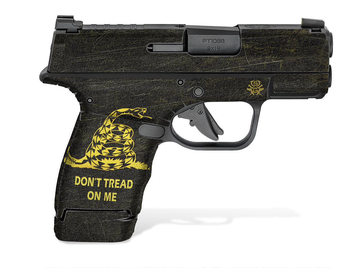Springfield Hellcat Micro-Compact Decal Grip. Features an amazing rubberized, textured grip surface for a better, and more comfortable hold. Decal grip is precision cut to fit the Hellcat Micro-Compact. Cover just the frame or entire gun.  Don’t Tread On Me design.