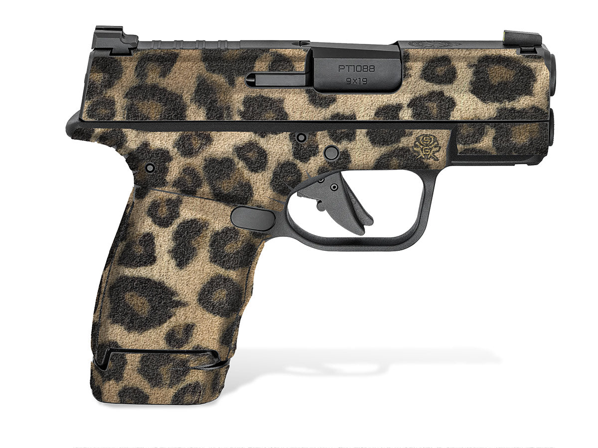 Springfield Hellcat Micro-Compact Decal Grip. Features an amazing rubberized, textured grip surface for a better, and more comfortable hold. Decal grip is precision cut to fit the Hellcat Micro-Compact. Cover just the frame or entire gun. Leopard Print design.