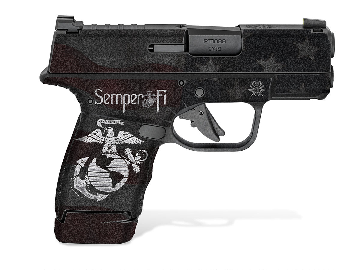 Springfield Hellcat Micro-Compact Decal Grip. Features an amazing rubberized, textured grip surface for a better, and more comfortable hold. Decal grip is precision cut to fit the Hellcat Micro-Compact. Cover just the frame or entire gun. Semper Fi design.