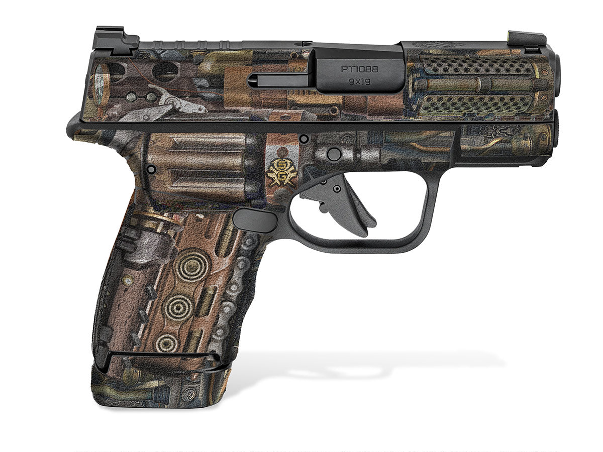 Springfield Hellcat Micro-Compact Decal Grip. Features an amazing rubberized, textured grip surface for a better, and more comfortable hold. Decal grip is precision cut to fit the Hellcat Micro-Compact. Cover just the frame or entire gun. Steampunk design.