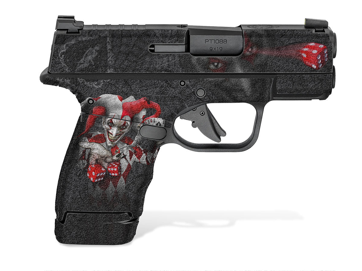 Springfield Hellcat Micro-Compact Decal Grip. Features an amazing rubberized, textured grip surface for a better, and more comfortable hold. Decal grip is precision cut to fit the Hellcat Micro-Compact. Cover just the frame or entire gun. The Joker design.