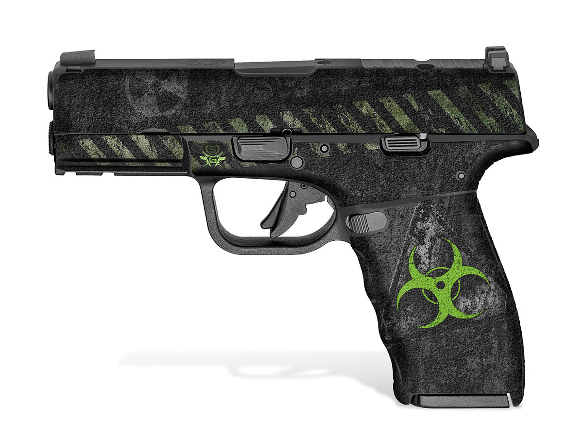 Springfield Hellcat Pro Decal Grip. Features an amazing rubberized, textured grip surface for a better, and more comfortable hold of your 3.7″ Hellcat Pro. Cover just the frame or entire gun.  Biohazard design.