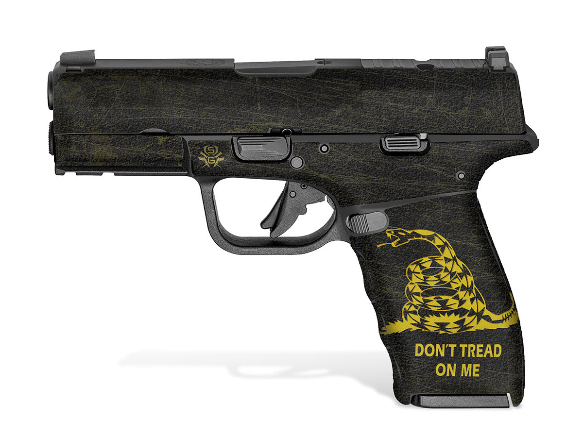 Springfield Hellcat Pro Decal Grip. Features an amazing rubberized, textured grip surface for a better, and more comfortable hold of your 3.7″ Hellcat Pro. Cover just the frame or entire gun. Don’t Tread On Me design.