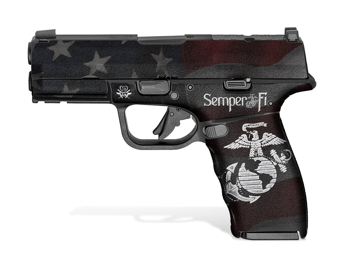 Springfield Hellcat Pro Decal Grip. Features an amazing rubberized, textured grip surface for a better, and more comfortable hold of your 3.7″ Hellcat Pro. Cover just the frame or entire gun. Semper Fi design.