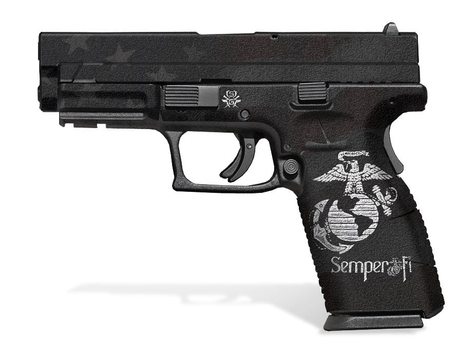 Springfield XD Decal Grip for the 4″ 9mm and .40 models. Also known as “Legacy Series XD“. Our decal grips feature an amazing rubber-like, textured grip surface for a better, and more comfortable hold of the 4″ XD. Cover just the frame or entire gun. Easy, do-it-yourself installation. Semper Fi design.
