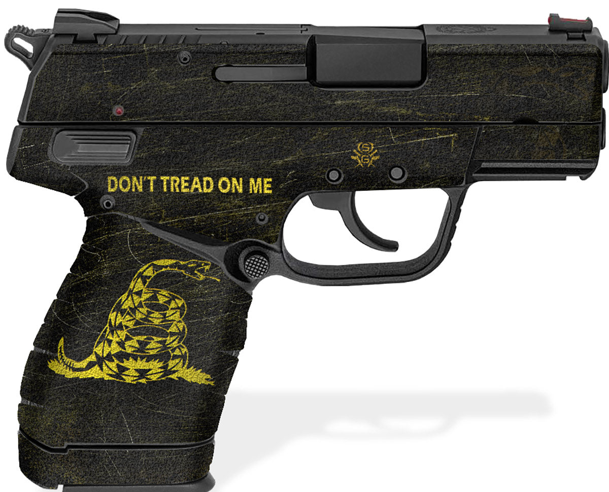 Springfield XD-E Decal Grip for 3.3″ models. Features an amazing rubberized, textured grip surface for a better, and more comfortable hold of your XD-E. Cover just the frame or entire gun. Easy, do-it-yourself installation. Don’t Tread On Me design.
