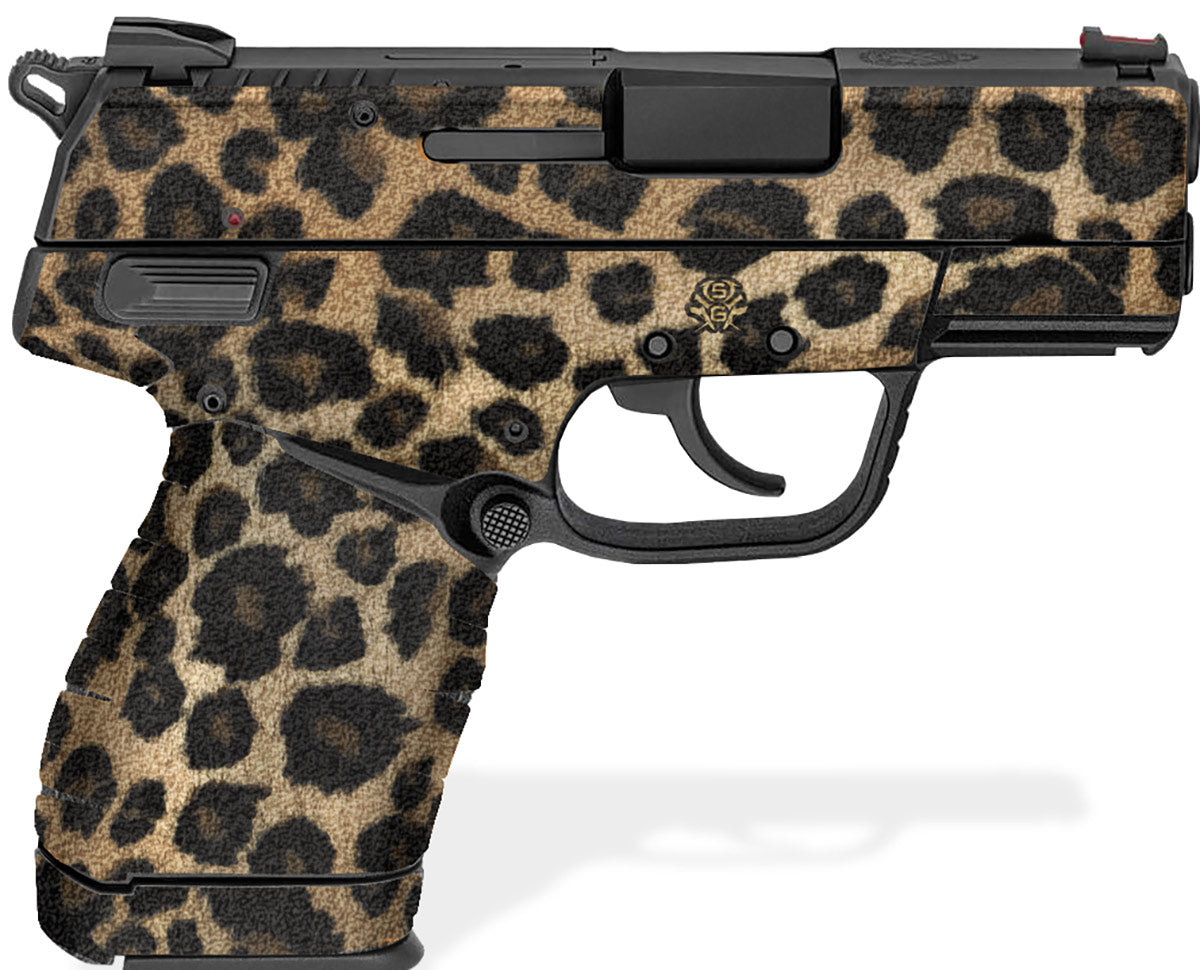 Springfield XD-E Decal Grip for 3.3″ models. Features an amazing rubberized, textured grip surface for a better, and more comfortable hold of your XD-E.  Cover just the frame or entire gun. Easy, do-it-yourself installation. Leopard Print design.