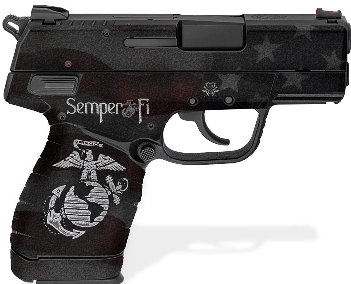 Springfield XD-E Decal Grip for 3.3″ models. Features an amazing rubberized, textured grip surface for a better, and more comfortable hold of your XD-E.  Cover just the frame or entire gun. Easy, do-it-yourself installation. Semper Fi design.