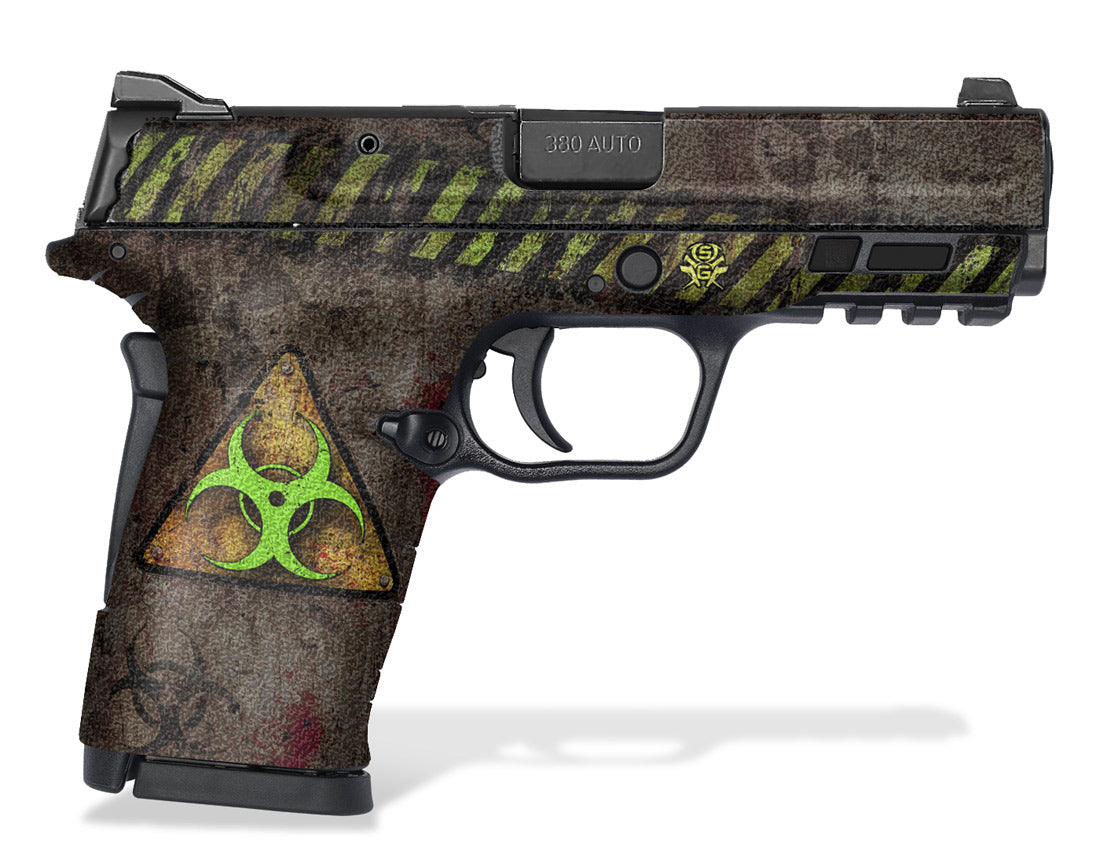 Smith & Wesson M&P Shield EZ M2.0 .380 Decal Grip – Manufactured with a rubberized, textured, non-slip vinyl that gives you a firm secure grip and won’t chaff or irritate your skin. Made with 3M adhesive specially formulated to mold into textured surfaces and stay on through harsh conditions. Cover just the frame of the micro-compact EZ .380 or apply it to the slide as well. Biohazard design.