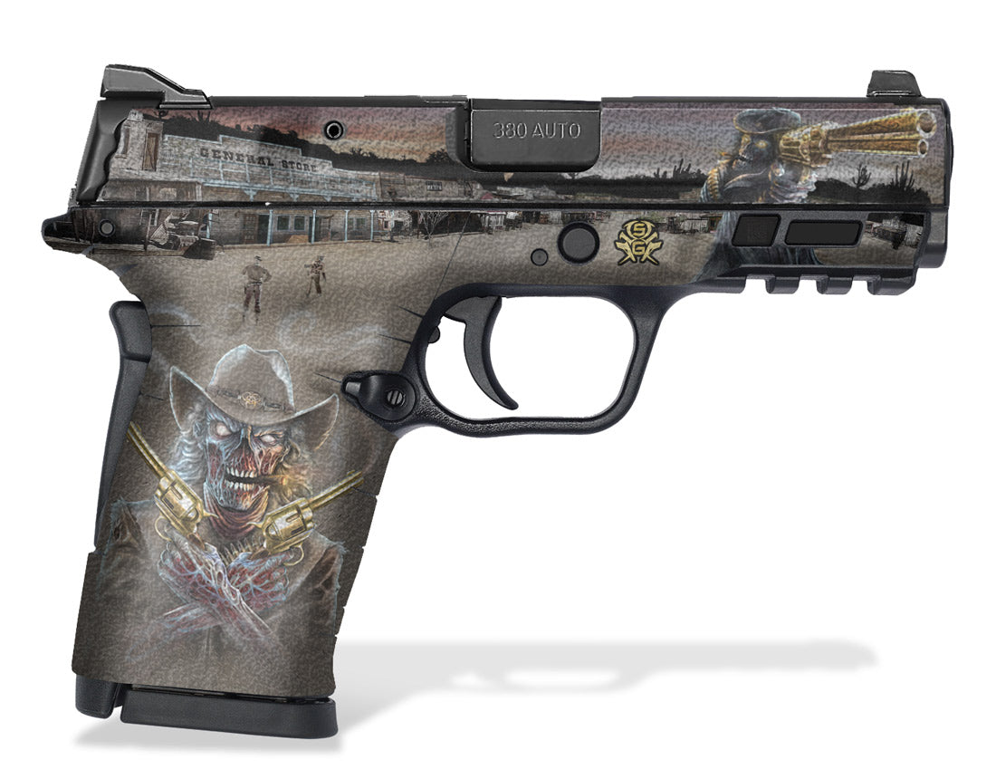 Smith & Wesson M&P Shield EZ M2.0 .380 Decal Grip – Manufactured with a rubberized, textured, non-slip vinyl that gives you a firm secure grip and won’t chaff or irritate your skin. Made with 3M adhesive specially formulated to mold into textured surfaces and stay on through harsh conditions. Cover just the frame of the micro-compact EZ .380 or apply it to the slide as well. Zombie Outlaw design.