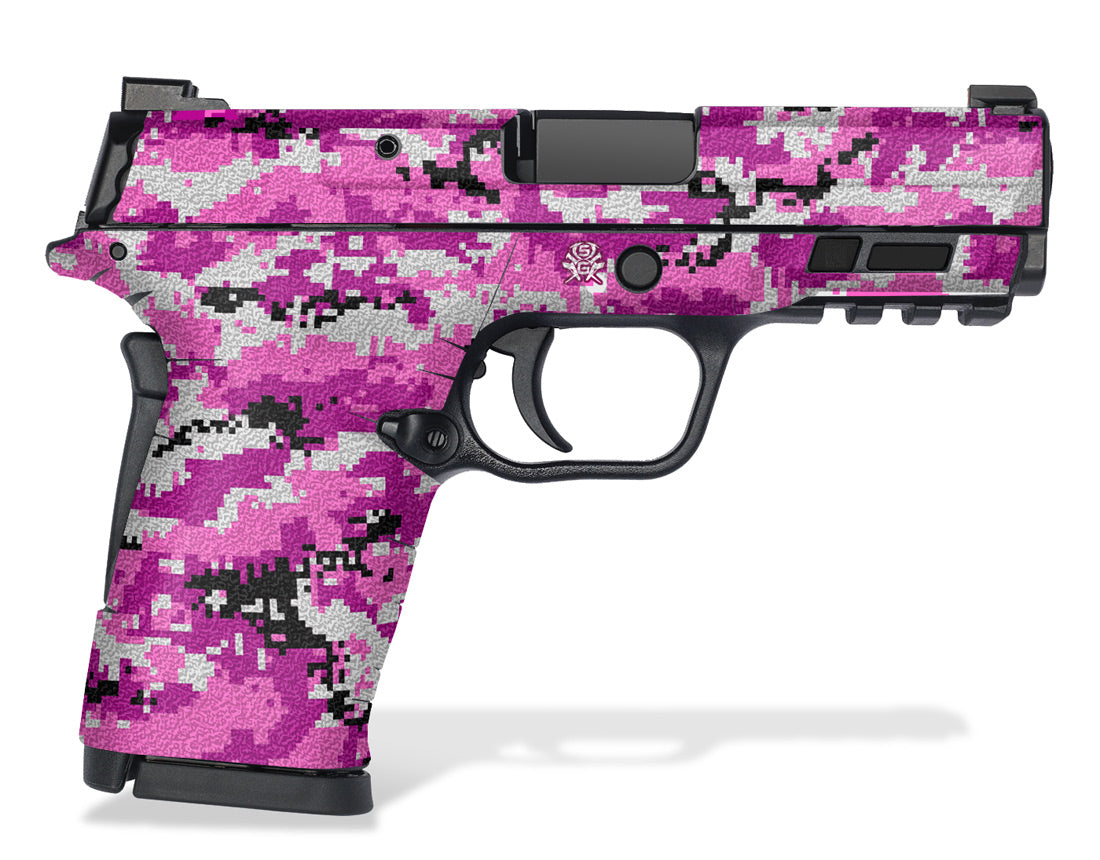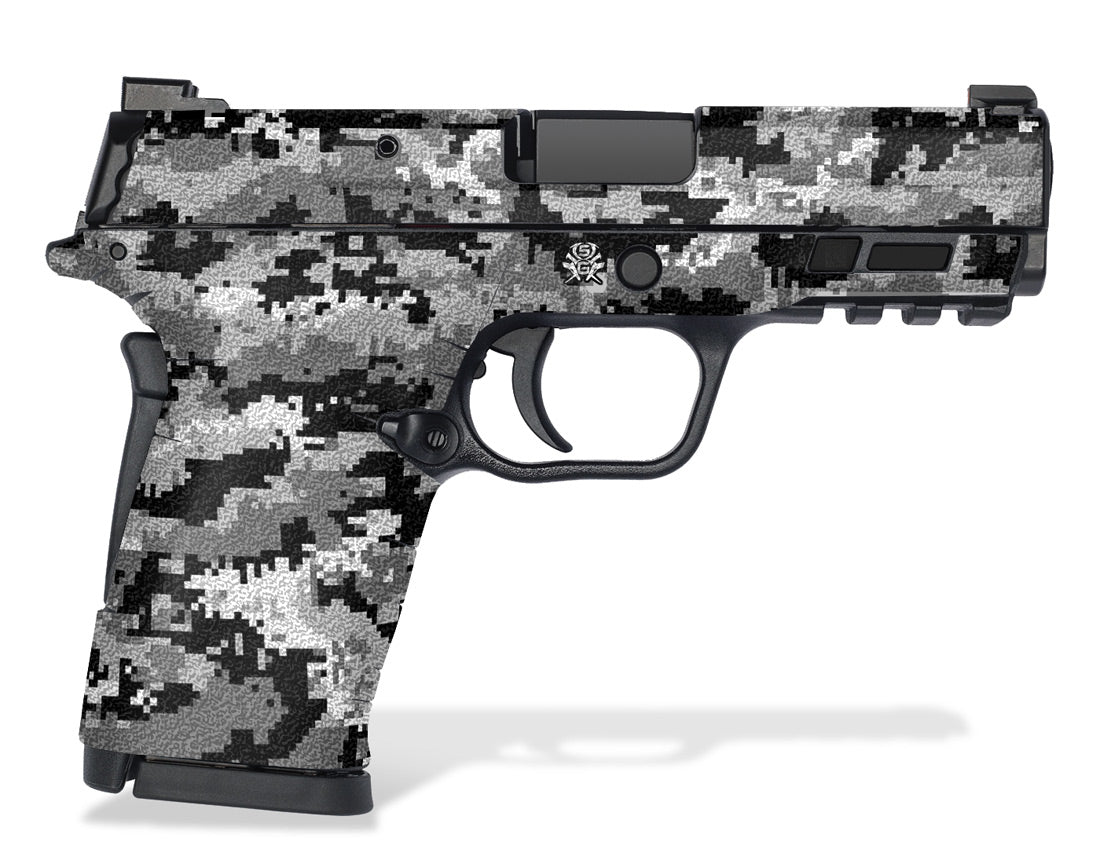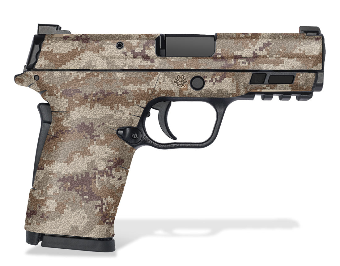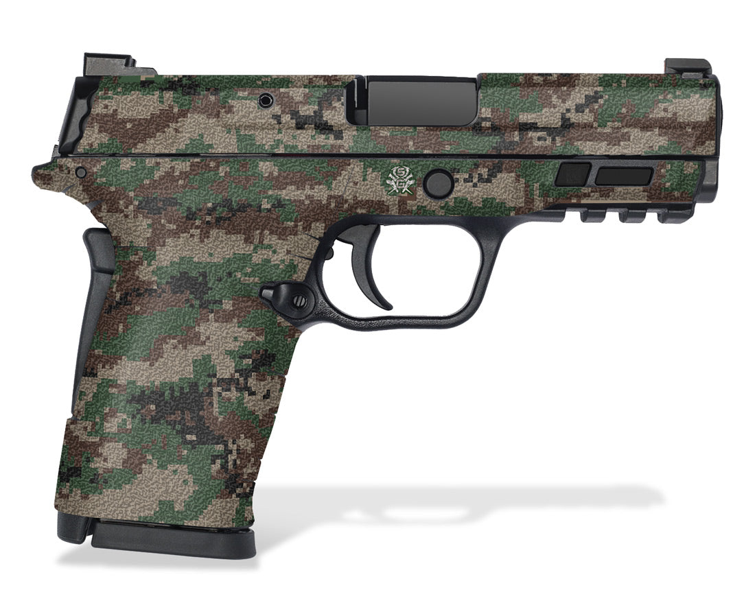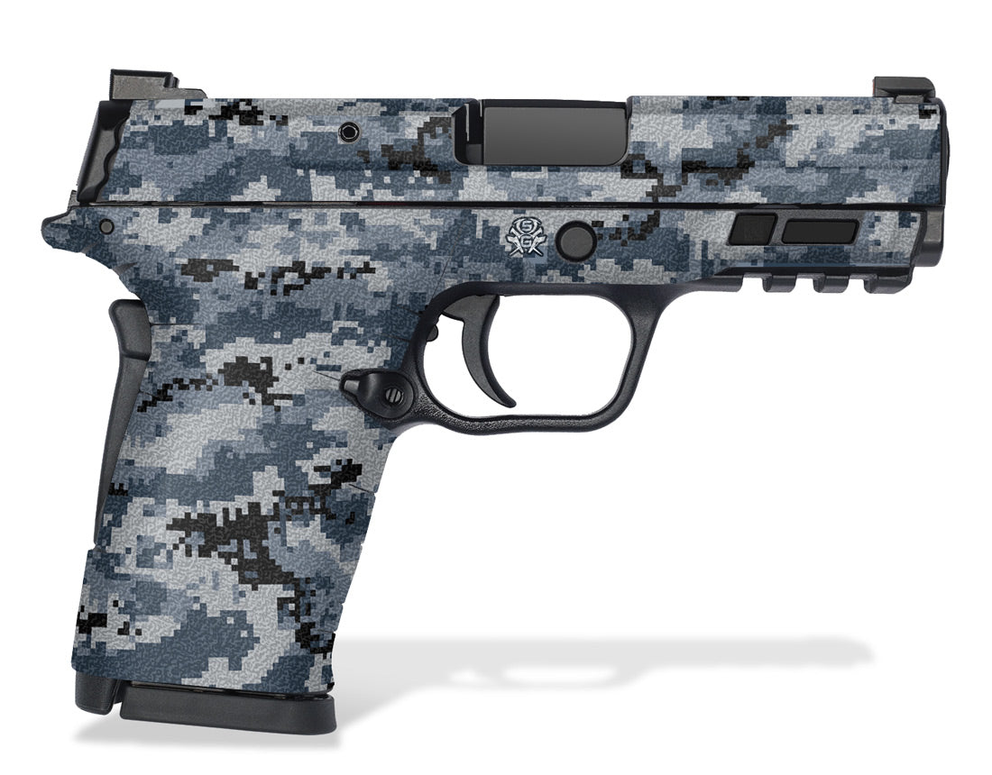 Smith & Wesson M&P Shield EZ M2.0 9mm Decal Grip – Manufactured with a rubberized, textured, non-slip vinyl that gives you a firm secure grip and won’t chaff or irritate your skin. Made with 3M adhesive specially formulated to mold into textured surfaces and stay on through harsh conditions. Cover just the frame of the micro-compact EZ 9mm or apply it to the slide as well. Digital Camo design.