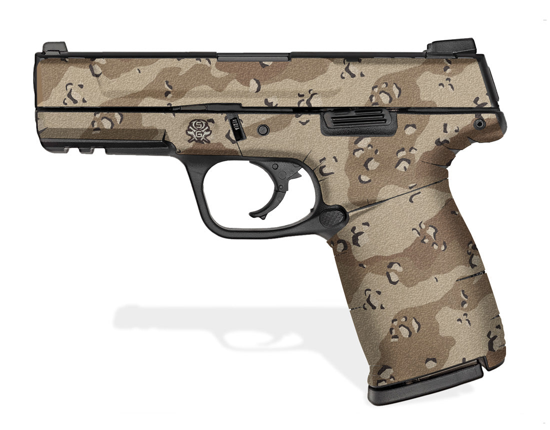 Decal Grip for S&W SD9, SD9VE, SD40 & SD40VE. Features an amazing rubber-like, textured grip surface for better grip and more control. Cover just the frame or apply it to the slide as well. Desert Camo design.