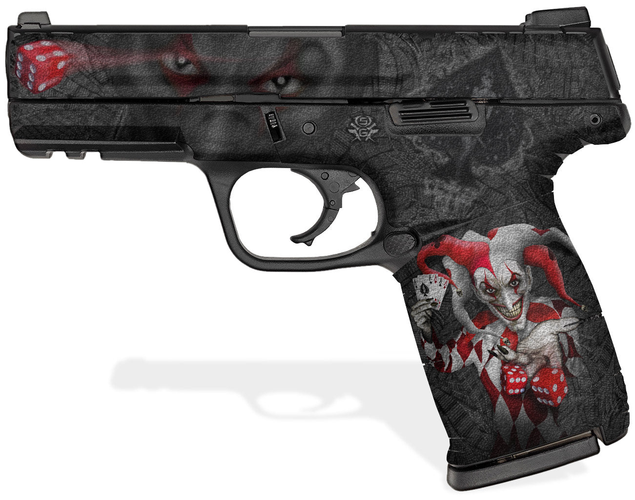 Showgun decal grips are manufactured with a rubberized, textured vinyl, and 3M adhesive specifically formulated to mold into textured surfaces and stay on through harsh environments and conditions. Cover just the frame or apply it to the slide as well. The rubberized feel is not only non-slip, but it won’t chaff or irritate your skin. The Joker design available here, templated to fit over 40 gun models (see below).