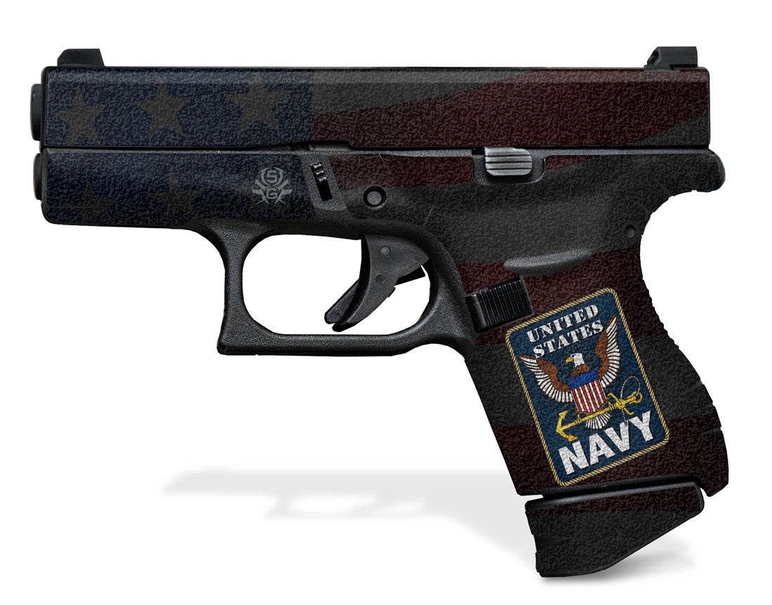 US Navy Decal Grip for Glock 42 – Features a slightly tacky, rubber-like, textured grip surface to give you better grip and more control of the G42 small frame. Includes trim-to-fit decals to cover factory base plate, extended base plate or aftermarket magazine extension. United States Navy design.