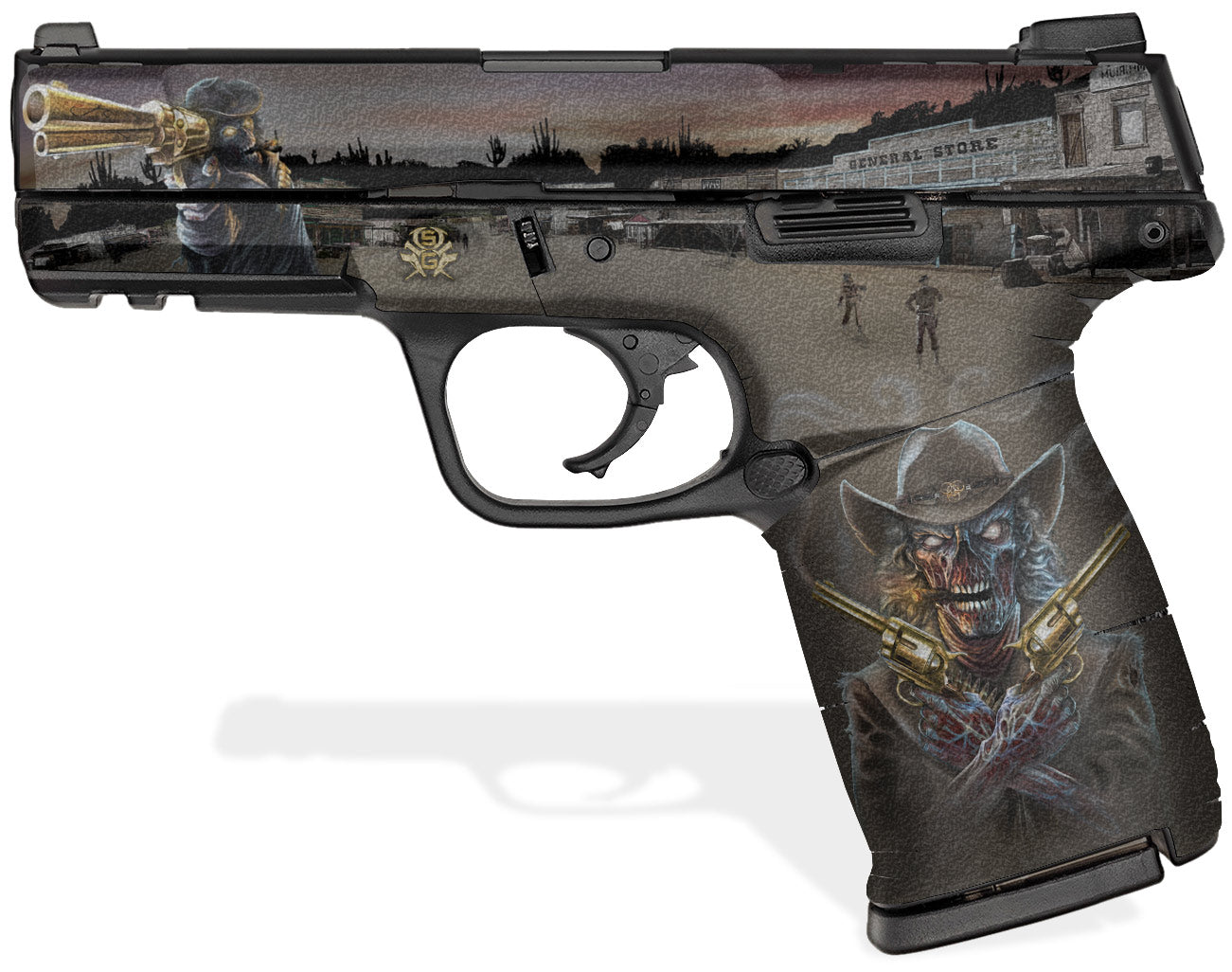 Showgun decal grips are manufactured with a rubberized, textured vinyl, and 3M adhesive specifically formulated to mold into textured surfaces and stay on through harsh environments and conditions. Cover just the frame or apply it to the slide as well. The rubberized feel is not only non-slip, but it won’t chaff or irritate your skin. Zombie Outlaw design available here, templated to fit over 40 gun models (see below).